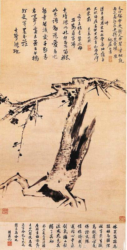 第二首诗写道:“得本还时末也非,曾无地瘦与天肥。梅花画里思思肖,和尚如何如采薇。”诗中用了两个典故,一是元初遗民画家郑思肖,在南宋灭亡之后隐居吴下,画兰花露根不画坡土,人问何故,他回答说:“土地都被人抢夺去了,你难道不知吗?”二是殷遗民伯夷、叔齐在周灭殷以后,耻不食周粟,隐居首阳山采薇而食,直至饿死。原来八大这幅《古梅图》虬根外露,也不画坡土,是仿照郑思肖画兰之意,暗含着国土被清人所抢夺,他这个明代宗室子孙,之所以成了和尚,正如伯夷、叔齐采薇首阳山那样,不肯臣服于新王朝。国破家亡,复国无望,这使他不能不“苦泪交千点”了。