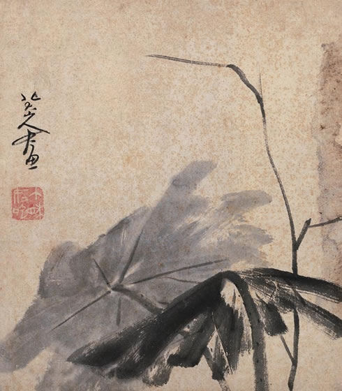 少,也许能有人作到,但是少而不薄,少而不贫,少而不单调,少而有味,少而有趣,透过少而给读者一个无限的思想空间,这是难有人作到的,八大却具备了如上的要求,这里大有文章。首先是他在用笔用墨上的功夫。他的用笔由方硬变圆润,饱和墨汁与运笔的方法相结合,一下笔就给人以浑厚丰富之感。他是第一个充分主动利用生宣纸特性以加强艺术表现力的画家。生宣纸的吸水能力强,容易使墨汁扩散(洇),这本来是缺点,而八大却把它变为优点,不但为水墨写意画开辟了一个广阔的前景,而且也创造了人们对水墨写意画的新观念,其功不朽。