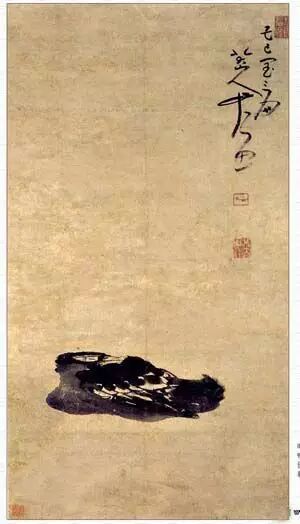八大由于他的特殊身世,和所处的时代背景,使他的画作不能像其它画家那样直抒胸臆,而是通过他那晦涩难解的题画诗和那种怪怪奇奇的变形画来表现。