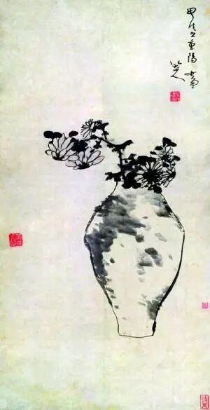比起山水画来,八大的花鸟画创作,更具有他风格个性的典型性。顺治十六年所作《传綮写生册》(台北故宫博物院藏),和康熙五年作的《墨花卷》(北京故宫博物院藏),是八大早期作品,从中可以看到他的水墨写意花鸟画创作,深受沈周、陈淳、徐渭的影响,其用笔较方硬,题材、布局也未脱离前人窠臼,但是画中所表现出的兀傲之气,以及不拘一格的大胆剪裁,如不求物象的完整性,却已预示着他的未来的发展。